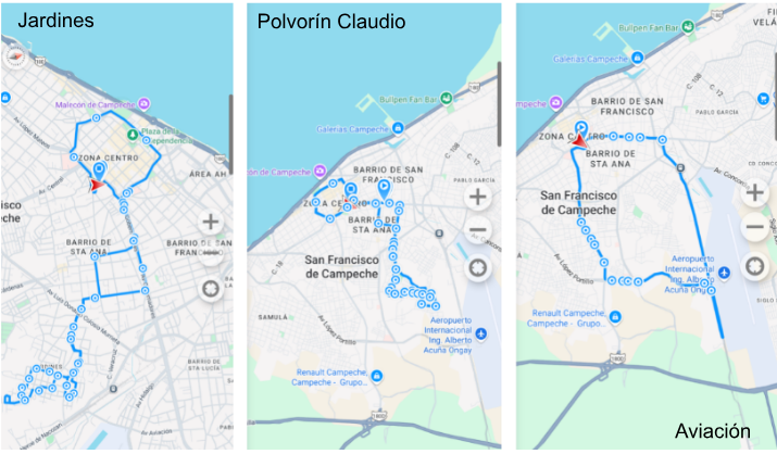En el presente proyecto se realizó el trazado y análisis de tres rutas de transporte urbano en la ciudad de San Francisco de Campeche. Estas fueron: Jardines, Aviación y Polvorín Claudio. El objetivo principal fue documentar con precisión el recorrido completo de cada ruta. Todas partieron desde puntos clave de la ciudad, realizaron su circuito habitual y concluyeron en zonas cercanas al inicio. Durante el trayecto se emplearon dos herramientas de geolocalización: un dispositivo GPS Garmin y una aplicación móvil. Ambas permitieron registrar con exactitud tanto la ruta como los waypoints o puntos clave. El propósito de esta actividad fue generar información geoespacial confiable que permita evaluar el funcionamiento del sistema de transporte urbano y sirva como base para futuros análisis territoriales o propuestas de mejora en la movilidad urbana de Campeche.